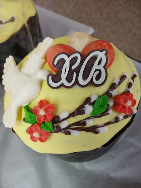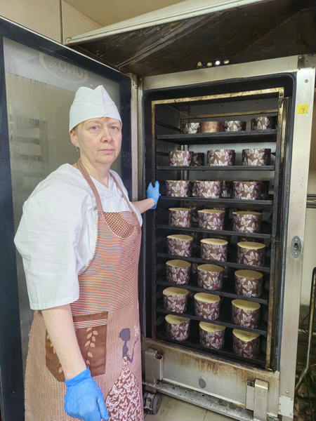 В цехе, где трудятся кондитеры Надежда Свиридова и Лариса Сокольская с раннего утра и до вечера кипит работа. На помощь им пришла завскладом Елена Евстигнеева – прекрасный специалист по художественному оформлению куличей.