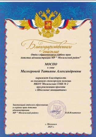 Отдельные слова благодарности были выражены Мосальскому потребительскому обществу, председателю Совета Малкеровой Т.А. за сотрудничество, активную жизненную позицию и финансовую поддержку муниципального проекта «Школьная инициатива».