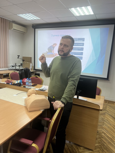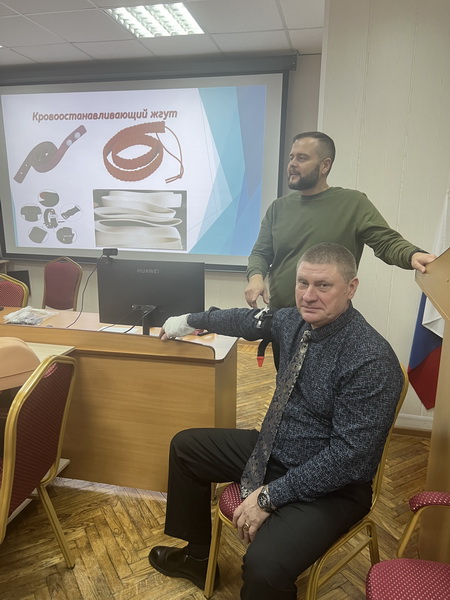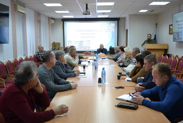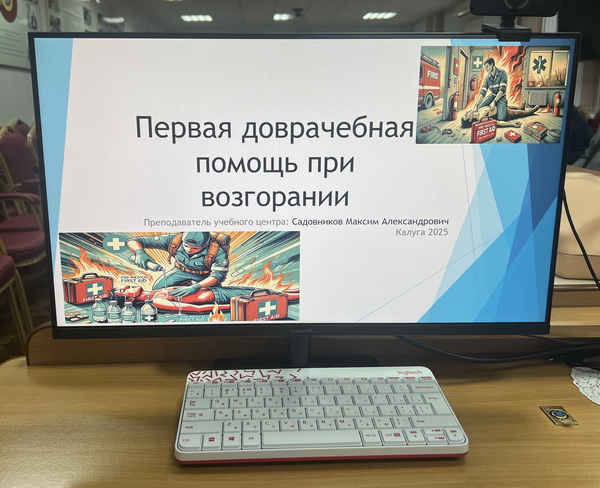 В рамках мероприятия преподаватель первой помощи Учебно-методического центра Калужского облсовпрофа, сотрудник скорой помощи Максим Садовников прочитал лекцию «Первая доврачебная помощь при возгорании». Максим Александрович остановился на мерах спасения пострадавших до приезда скорой помощи или до приезда в больницу, как остановить артериальное, венозное кровотечение, зафиксировать конечности при переломах, сделать искусственное дыхание, непрямой массаж сердца , что делать при отравлении угарным газом , какие ошибки чаще всего допускают при оказании первой помощи при пожаре, что делать после оказания первой помощи, что должно быть в аптечке. На примере одного из слушателей было показано как накладывать резиновый жгут.